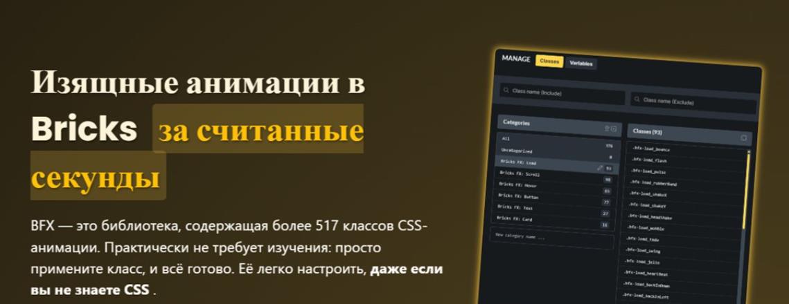 Bricks FX — это расширение для Bricks Builder, включающее более 500 профессиональных CSS-эффектов, которые можно применять к любым элементам через один CSS-класс. Плагин создан специально под Bricks, поэтому интеграция максимально гладкая и лёгкая даже для тех, кто не пишет JavaScript.